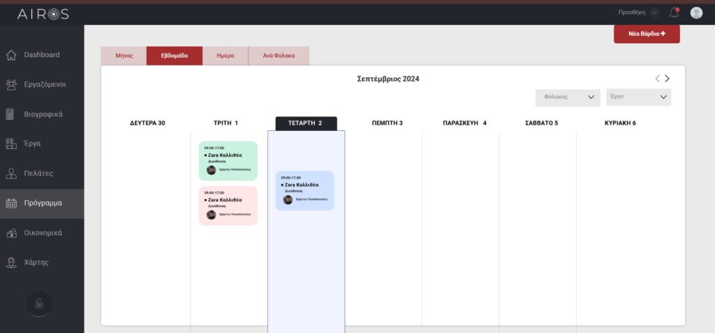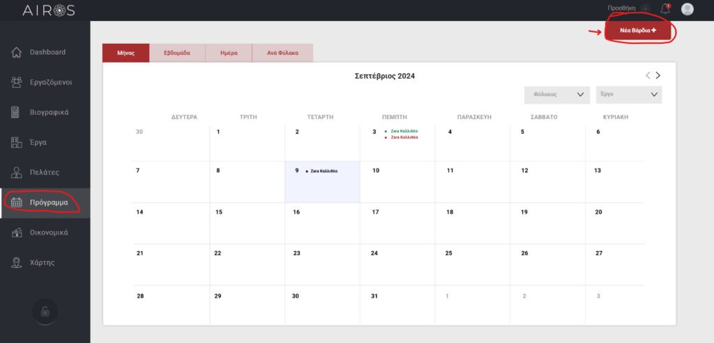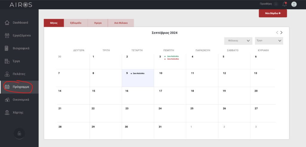 Προκειμένου να δείτε ποιος εργαζόμενος βρίσκεται που ανά πάση στιγμή, ποιος είναι στην επόμενη βάρδια αλλά και για να προσθέσετε εργαζόμενους για τα projects μπορείτε να πάτε στη σελίδα πρόγραμμα. Εκεί αρχικά φαίνονται οι αναθέσεις συνολικά για κάθε μήνα.