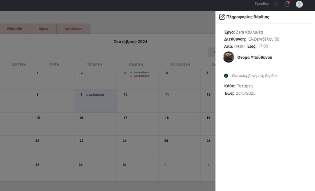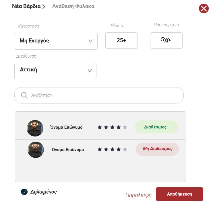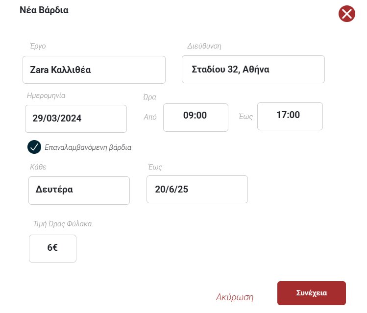 Αφού πατήσετε Νέα Βάρδια θα ανοίξει το ακόλουθο παράθυρο προκειμένου να συμπληρωθούν τα στοιχεία της νέας βάρδιας και πατώντας Συνέχεια μπορείτε να κάνετε την ανάθεση σε συγκεκριμένο φύλακα.