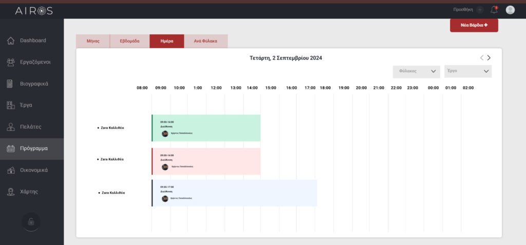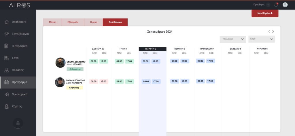 Επίσης προκειμένου να έχετε μια πιο συγκεκριμένη εικόνα των βαρδιών μπορείτε να επισκεφθείτε τις καρτέλες Εβδομάδα, Ημέρα, Ανά Φύλακα όπου φαίνονται πιο αναλυτικά οι βάρδιες ανά φύλακα.