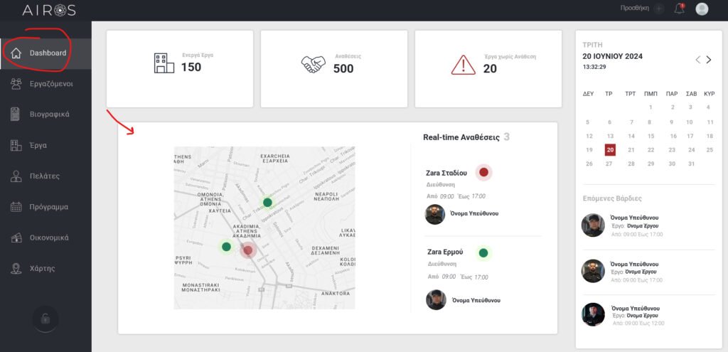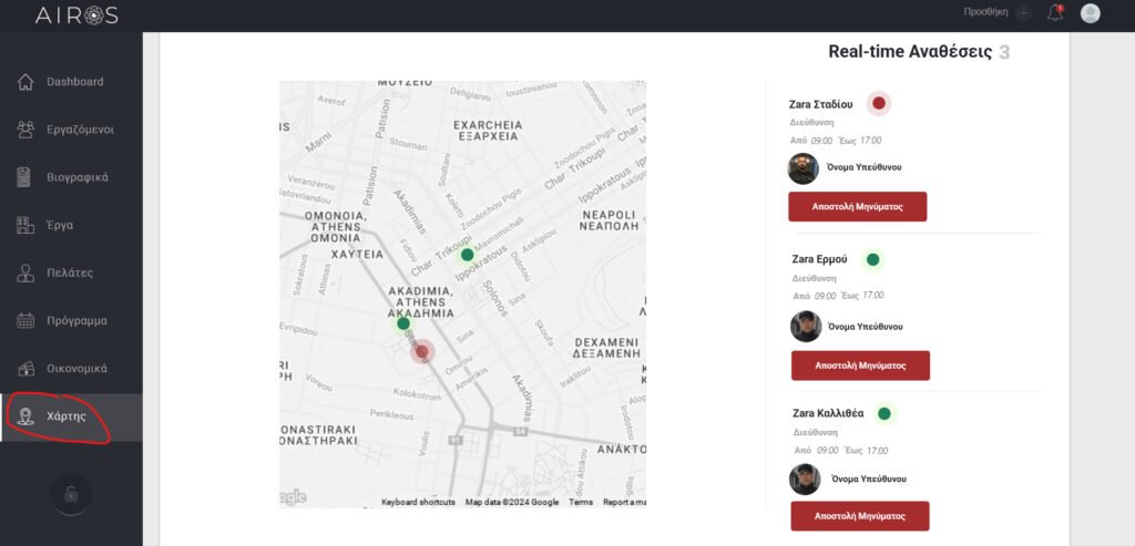 Δίνεται η δυνατότητα στον χρήστη να βλέπει σε πραγματικό χρόνο στον χάρτη τις αναθέσεις που υπάρχουν. Η δυνατότητα αυτή δίνεται είτε μέσω του Dashboard είτε μέσω της επιλογής Χάρτες.